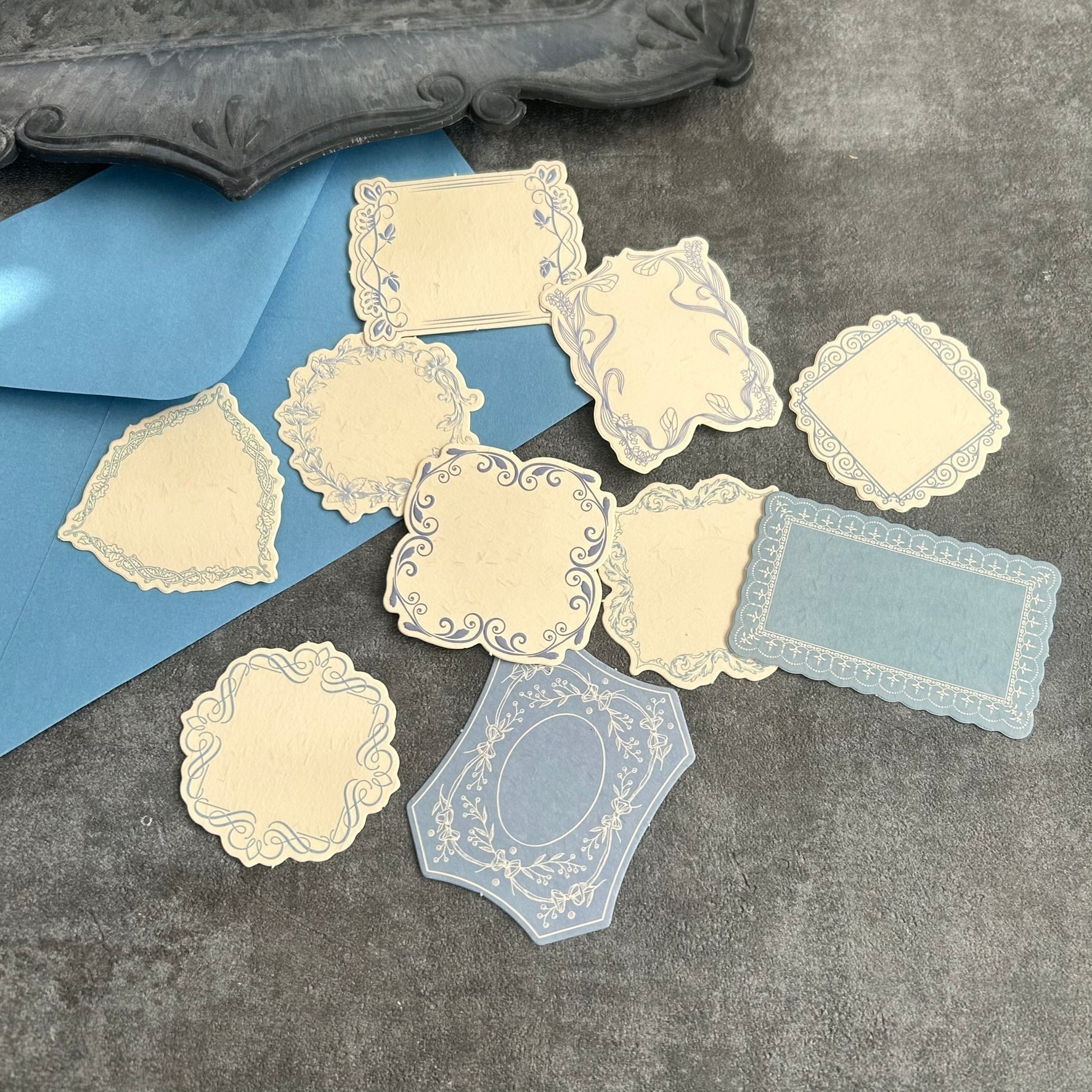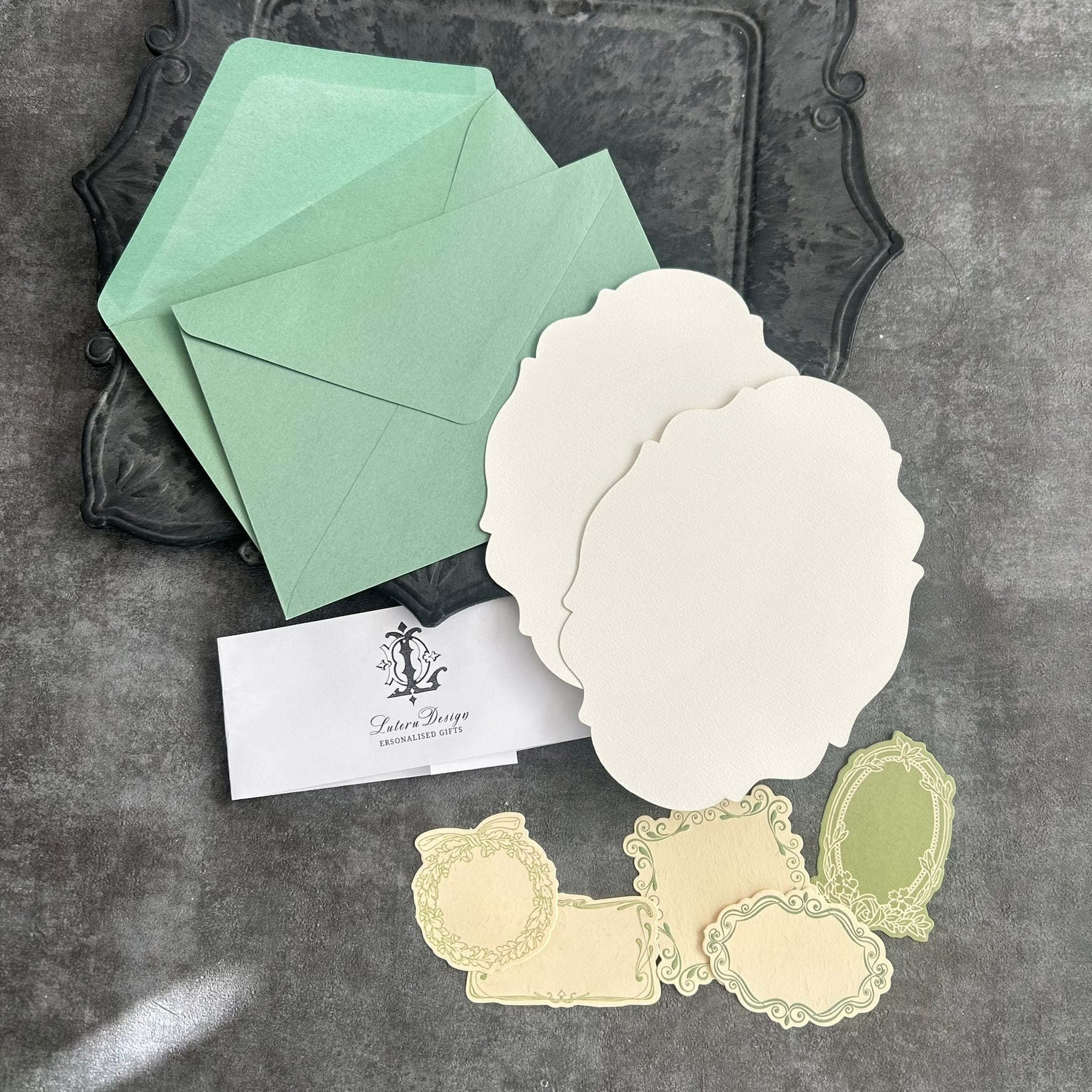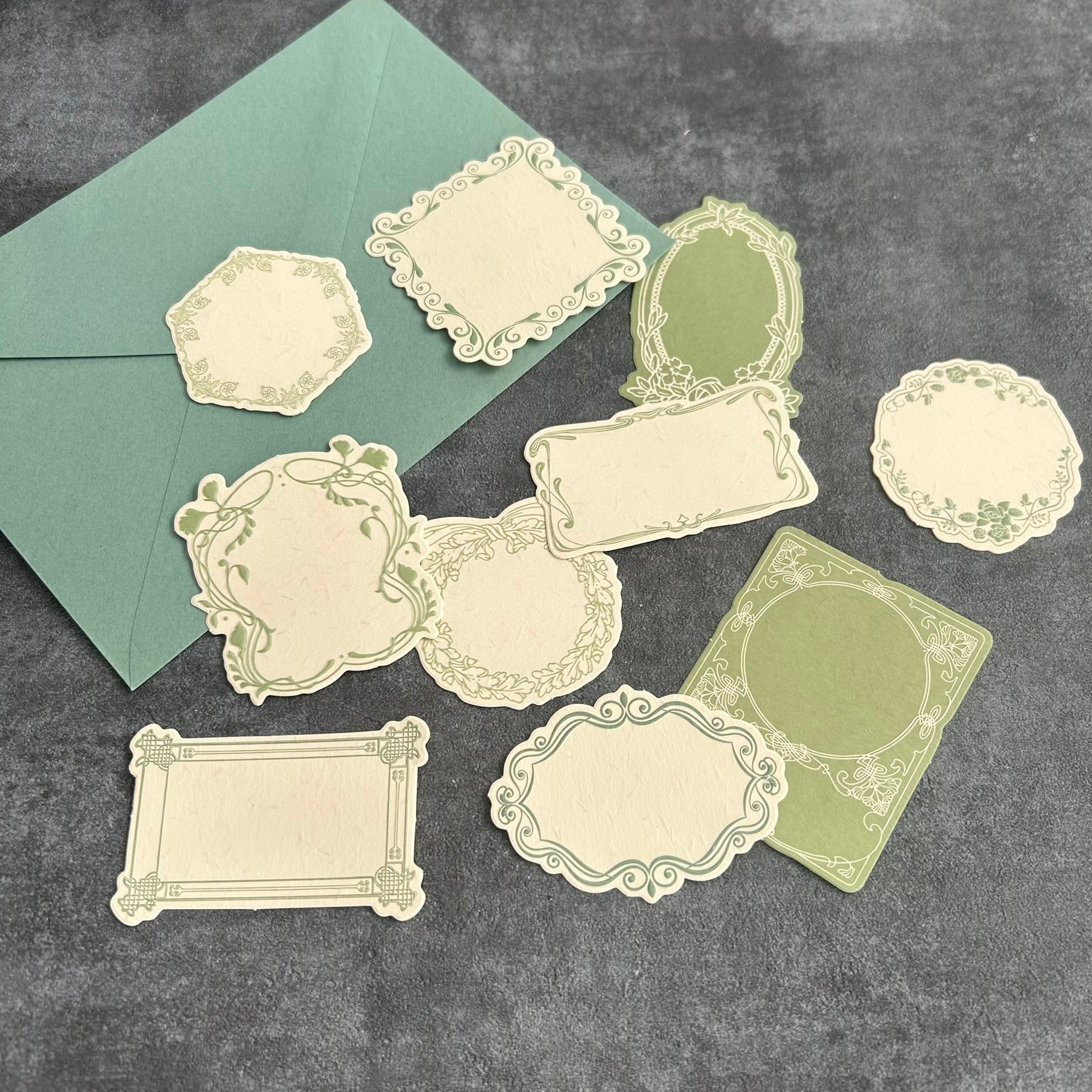 発色がきれいなグリーンとブルーの封筒2枚と、飾りオーバルカード2枚、