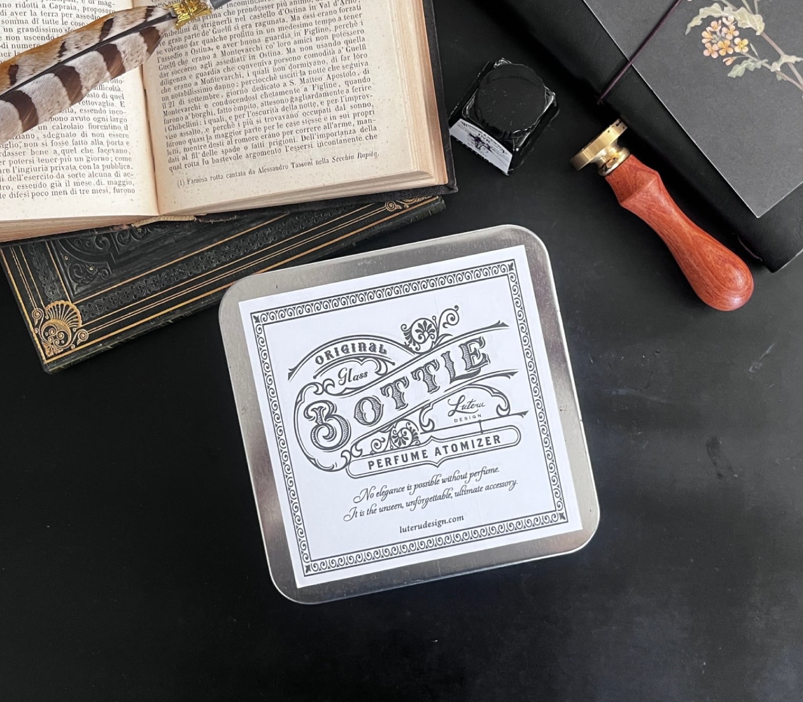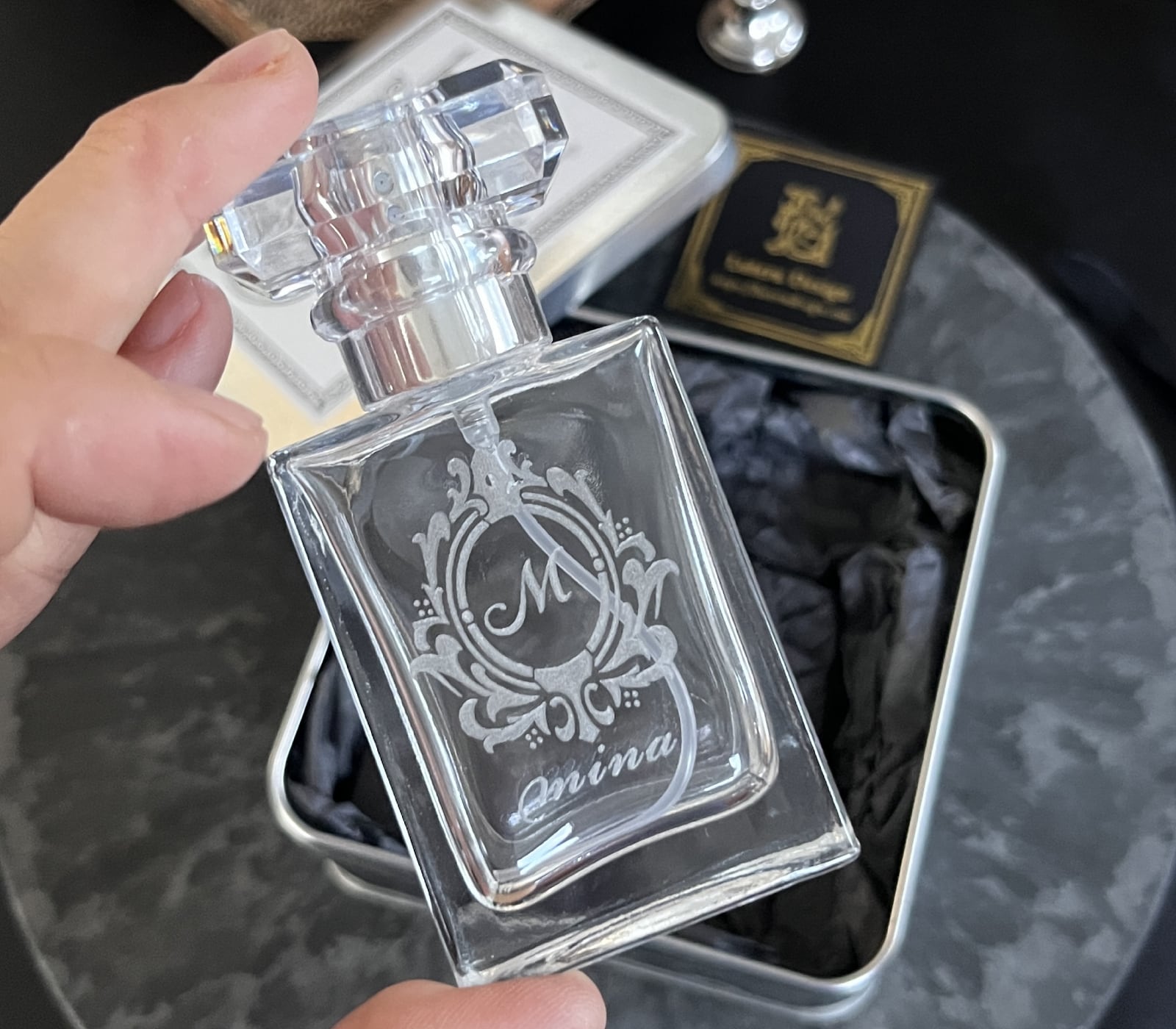 イニシャルと名前を刻んだ、スプレー式のガラスアトマイザー。