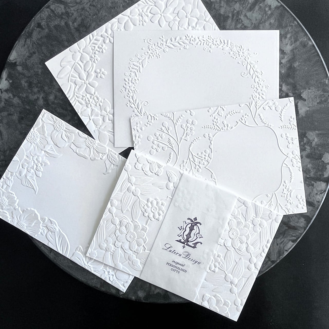 美しいフラワーフレームがエンボスされたポストカード3枚セット。