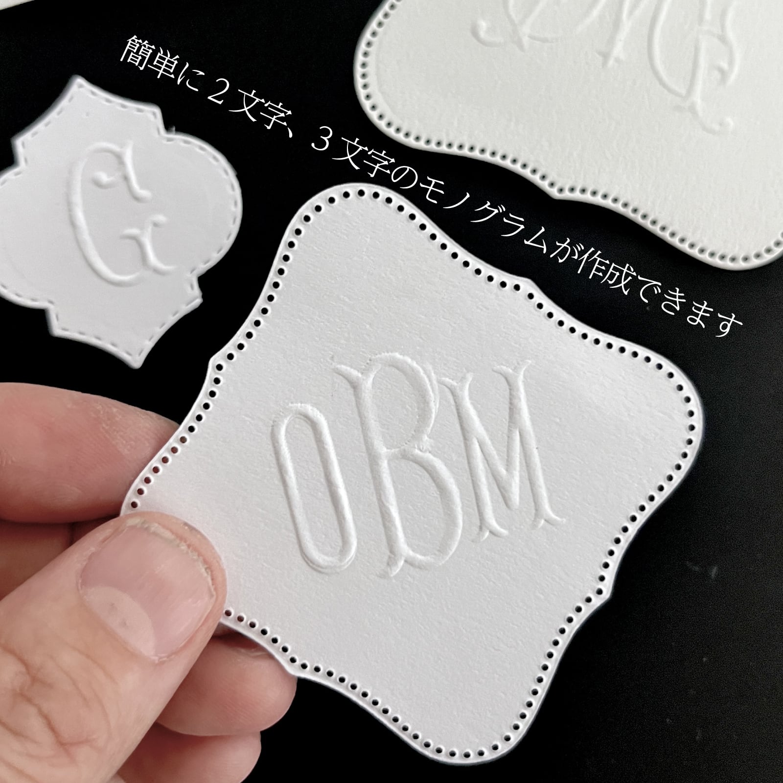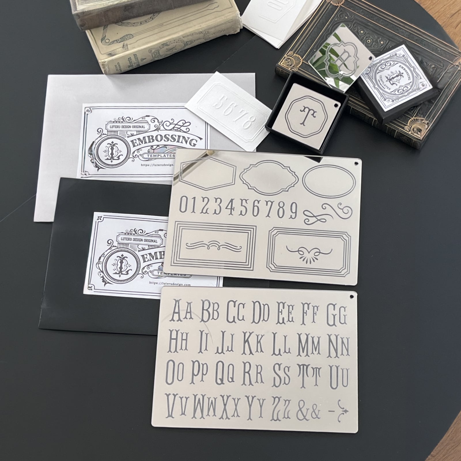 フレームと文字を組み合わせて自由にエンボス加工ができる、ルテルデザインオリジナルのエンボステンプレート。